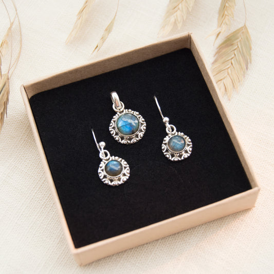 Neema | Set 925 zilver oorbellen en hanger met labradoriet