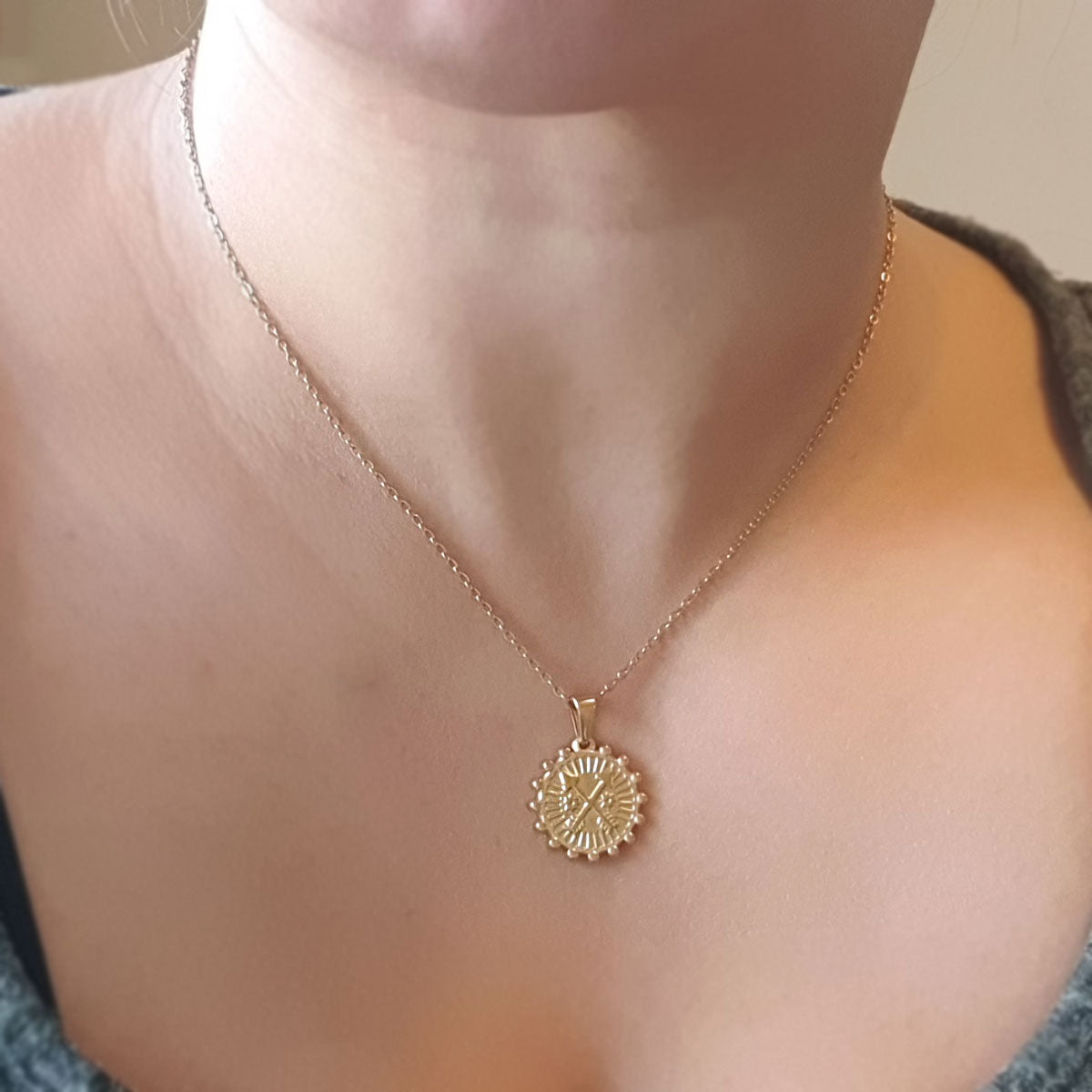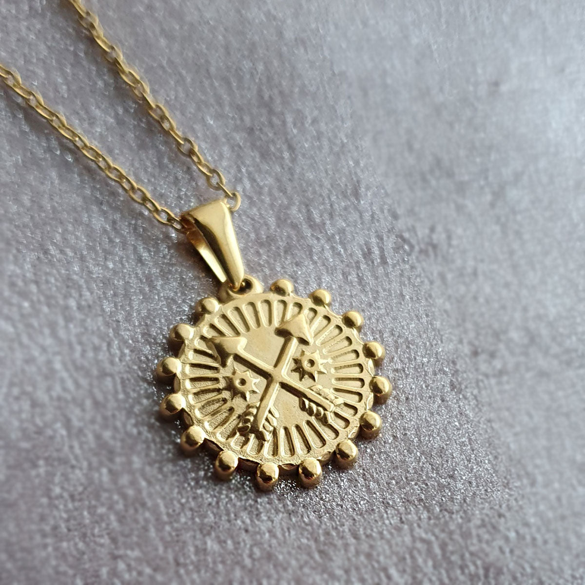 Hoe tof is deze gouden muntketting met pijlen? Het muntje met pijlen en zonnestralen geeft een vintage vibe die overal bij past. Gemaakt van stainless steel, dus hij blijft lang mooi, is supersterk én geschikt voor een gevoelige huid.