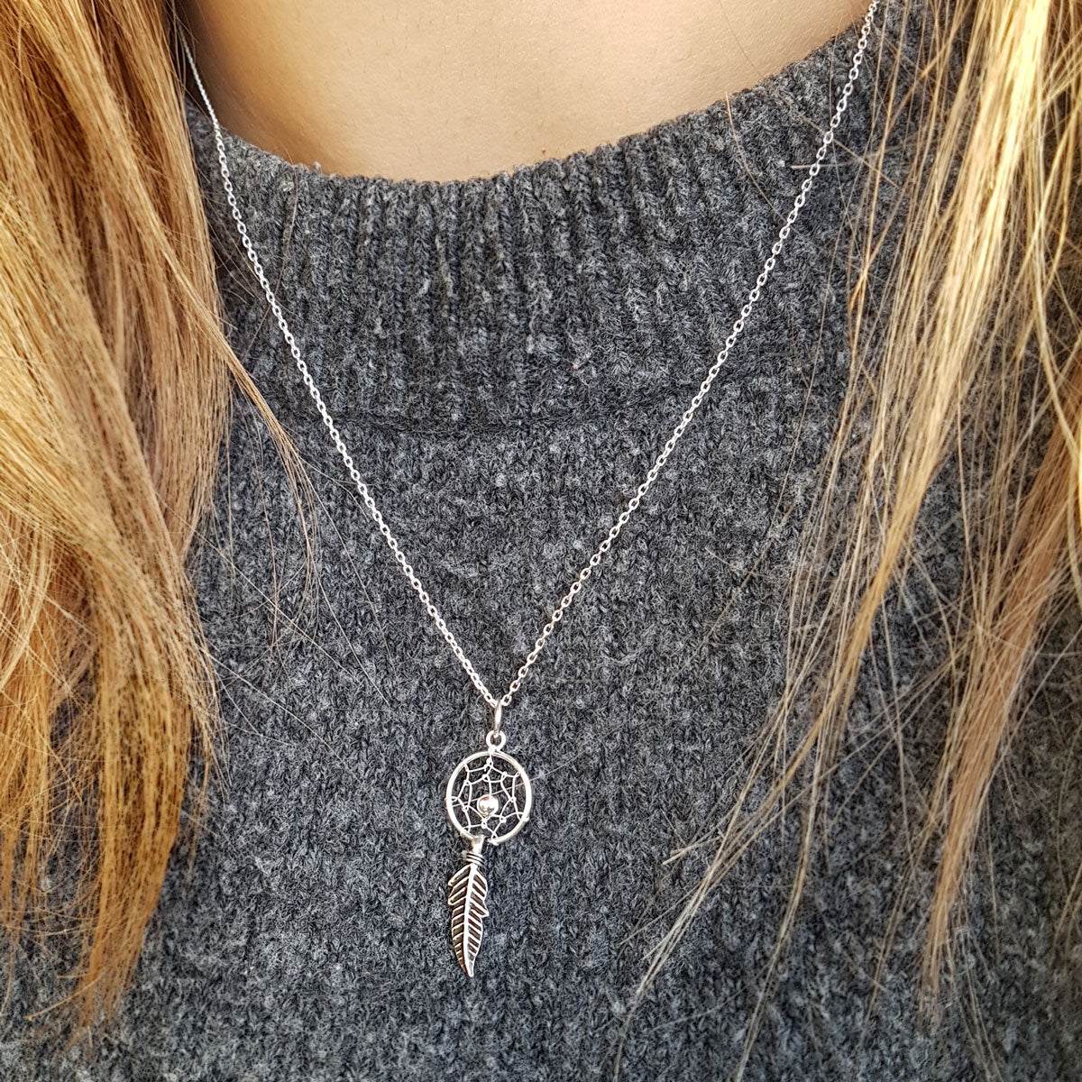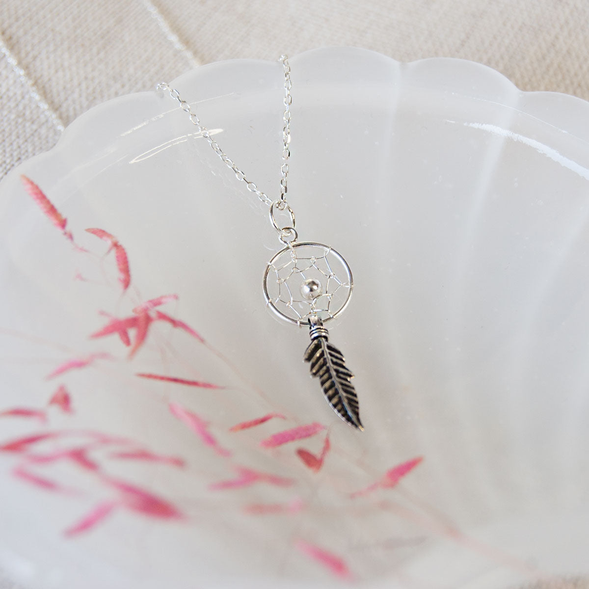 Een charmante zilveren ketting met een hanger in de vorm van een dromenvanger, verfraaid met een hangend veertje. Gemaakt van sterling zilver.