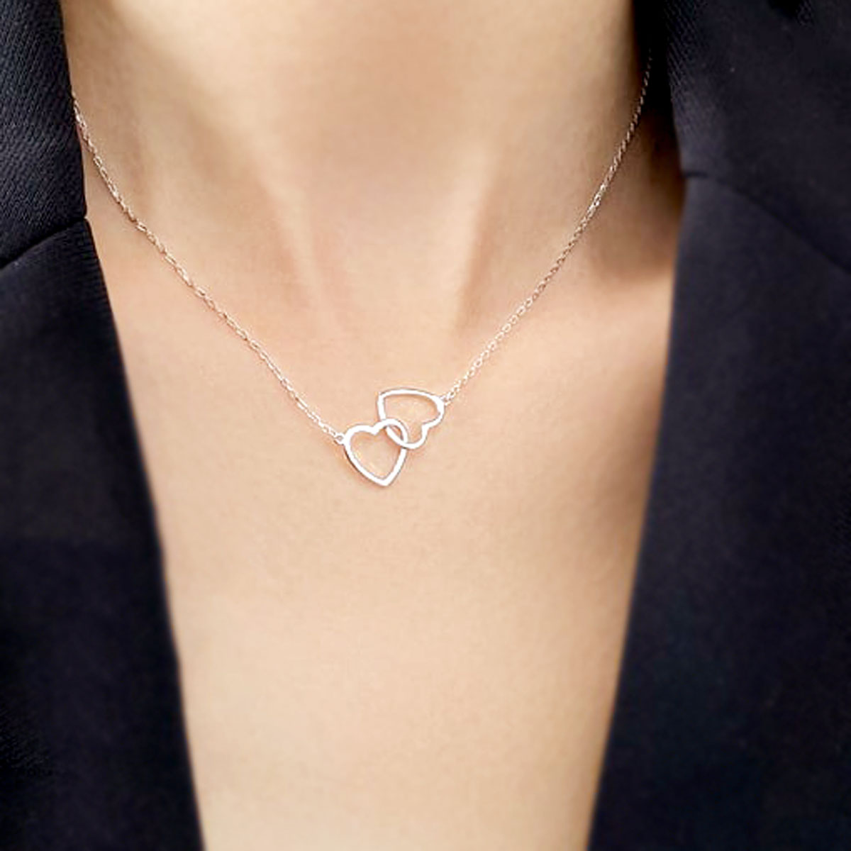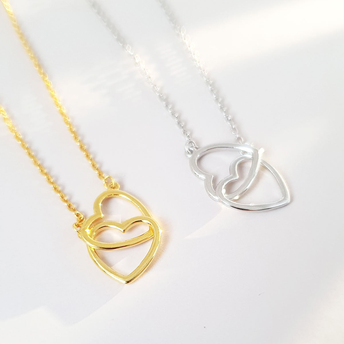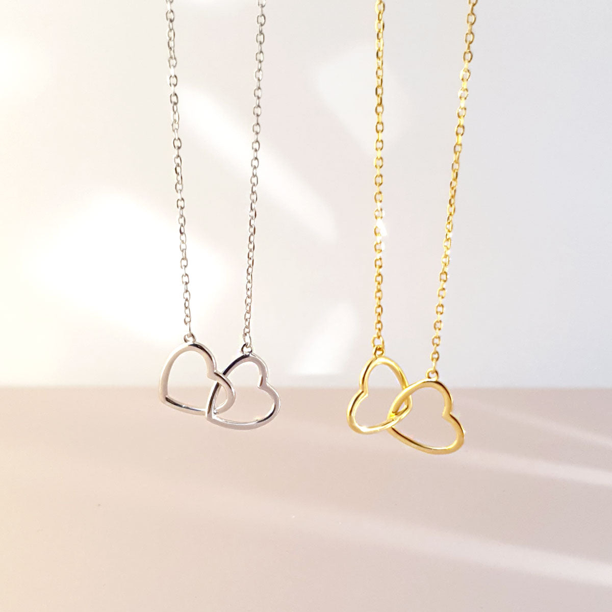 Mooie ketting met twee open hartjes. De twee in elkaar verweven harten symboliseren een diepe band van liefde en verbondenheid. Dit sieraad is perfect als cadeau voor een speciaal iemand, of als herinnering aan een dierbare connectie.
