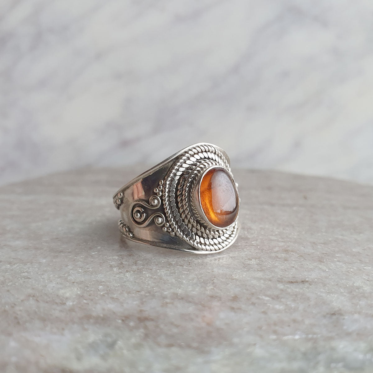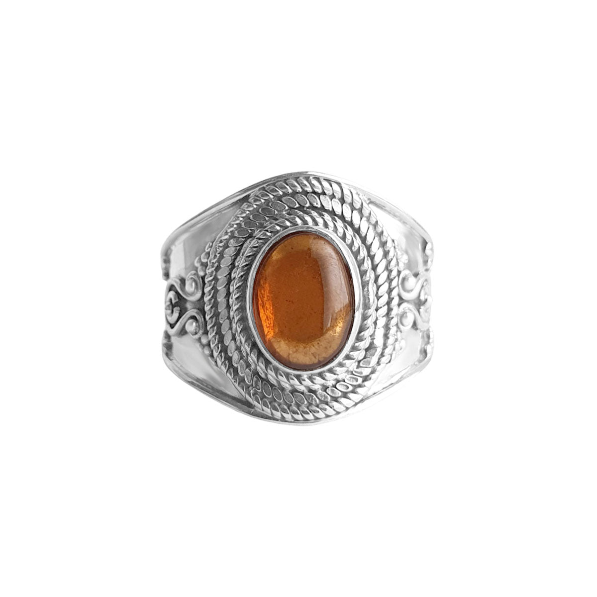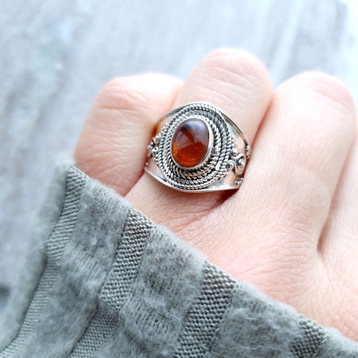 Deze prachtige 925 sterling zilveren ring is een echte blikvanger! In het midden schittert een warme, oranjebruine hessonietsteen. De steen wordt omringd door een speels gevlochten zilveren rand en heeft mooie sierlijke details aan de zijkanten, die se ring een vintage uitstraling geven. Perfect voor wie houdt van een kleurrijke touch in de sieradencollectie!