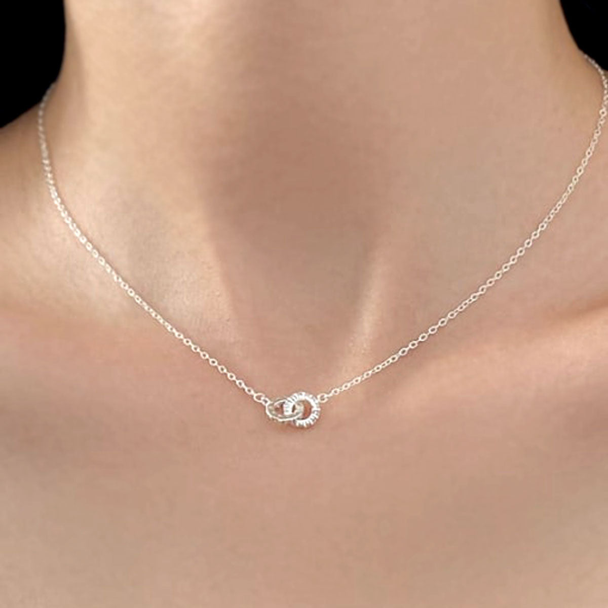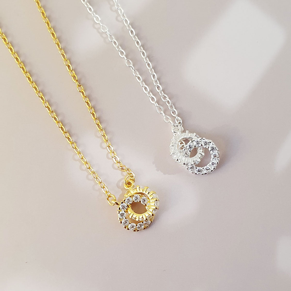 Deze fijne ketting van 925 sterling zilver met twee in elkaar verweven cirkels is een prachtig symbool van verbondenheid en balans. De subtiele ronde hangers zijn bezet met sprankelende zirkonia steentjes, wat deze ketting een speelse, maar chique uitstraling geeft.