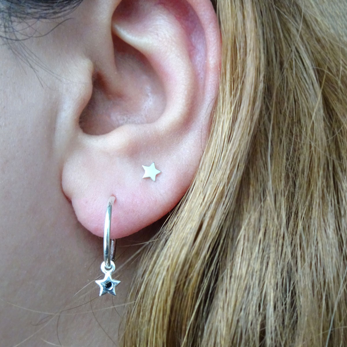 Maak jouw earparty helemaal af met deze oorringen. Het bedeltje is heeft een vorm van en ster en heeft een subtiele zwarte Swarovski steentje in het midden. Gemaakt van 925 sterling zilver en makkelijk te combineren met andere oorringen of studs.